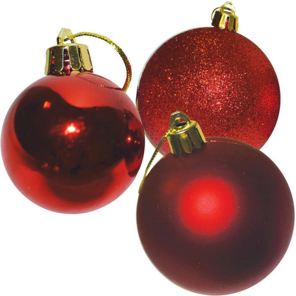Bola de 4 cm de diametro, na cor vermelha, com tres variedades, uma brilhante, uma fosca e outra coberta de glitter. Perfeita para decorar arvores de Natal, guirlandas ou outros enfeites, trazendo um toque festivo e luminoso a decoracao. Feita de material resistente e duravel.