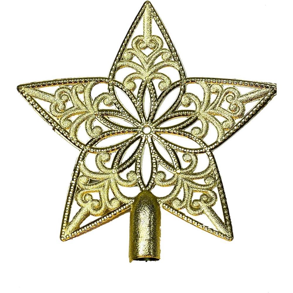 Estrela de Natal de 10 cm, ideal para ser colocada como ponteira no topo da arvore. Feita com material resistente, traz um toque brilhante e elegante a decoracao natalina. Perfeita para complementar a arvore de Natal com um detalhe classico.
