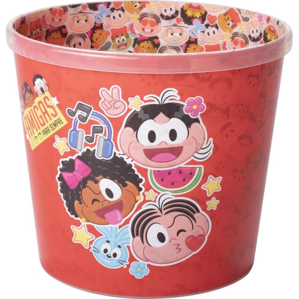 Pipoqueira balde com decoracao interna e externa do Turma Da Monica. Capacidade 2,1 litros. E um pote fabricado em plastico atoxico, livre de BPA e resistente. Decoracao injetada no plastico, nao adesivada.