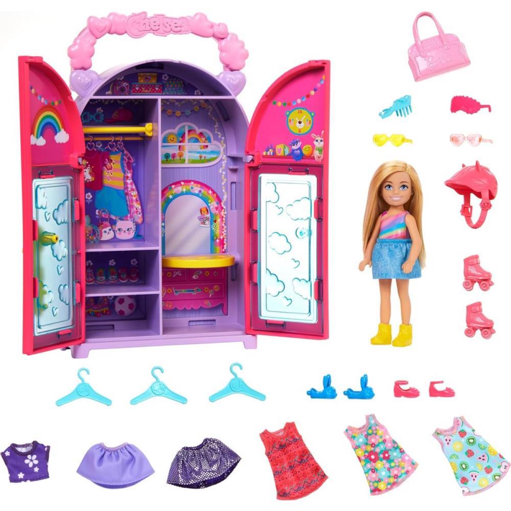 É hora de se preparar com a boneca Chelsea! Abra este conjunto de armário para revelar um guarda-roupa de sonho repleto de 15 peças de roupas e acessórios. Misture e combine roupas para criar quatro looks completos! Com peças divertidas como vestidos, capacete de gatinho, óculos de sol em formato de coração, chinelos de coelhinho e máscara de dormir - as crianças podem vestir a boneca Chelsea de manhã à noite! A boneca não pode ficar sozinha. Cores e decorações podem variar.