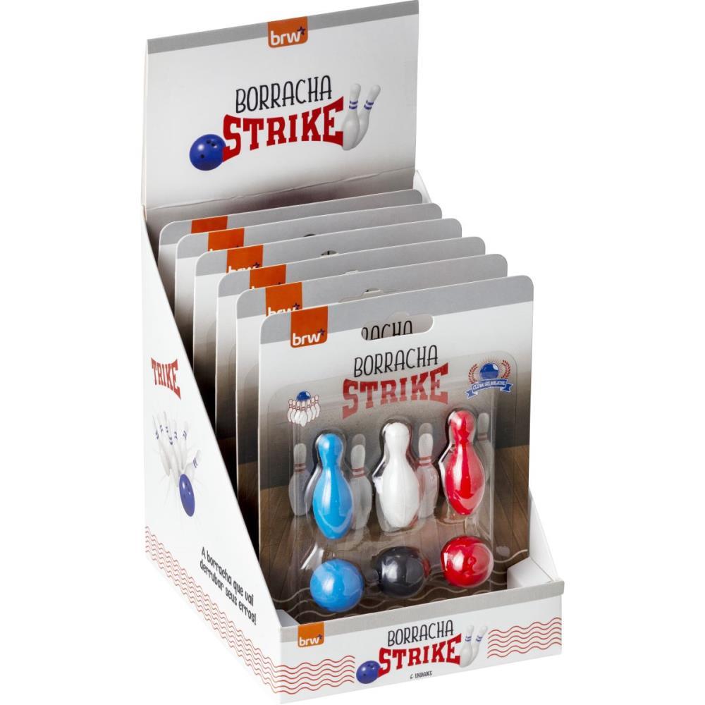 BORRACHA DECORADA E DIVERTIDA, STRIKE. FORMATO DE JOGO BOLICHE, DISPLAY COM 6 UNIDADES, SENDO 3 BORRACHAS EM FORMATO DE PINO DE BOLICHE E 06 UNIDADES DA BOLA DE BOLICHE. PROTUDO DIVERTIDO E PRESENTEAVEL