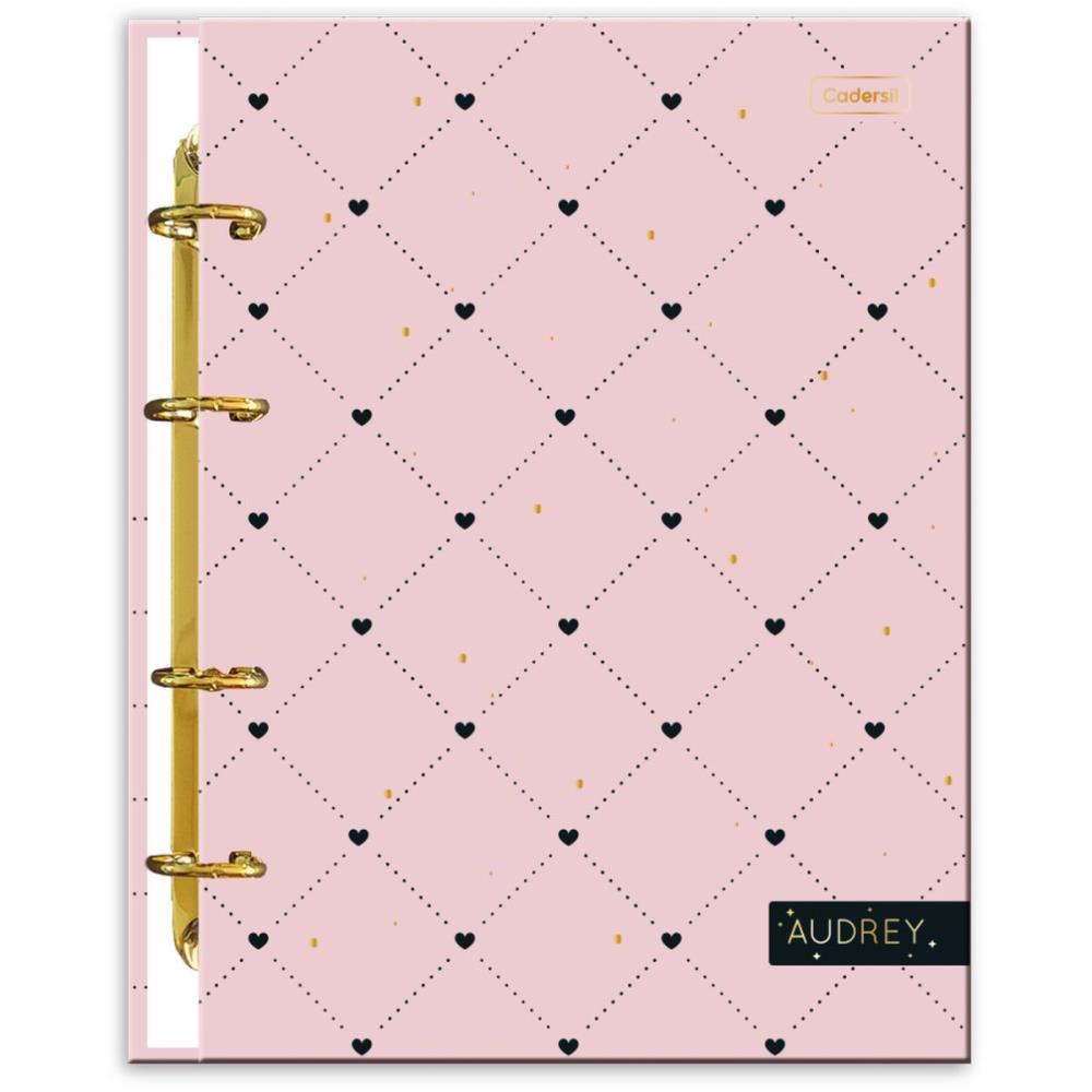 A linha Audrey traz estilo e delicadeza em suas capas! O caderno colegial argolado conta com 6 divisorias em tons pasteis para separar as folhas de acordo com a conveniencia da comsumidora. Outro detalhe delicado na capa e o hot stamping dourado. O produto tambem conta com uma cartela de adesivos para personalizar as anotacoes. DETALHES Capa: dura, laminacao fosca com aplicacao de hot stamping dourado Argola: dourada Folhas: 80 brancas com pautas pretas Acessorios: bolsa portfolio, cartela de adesivos, 6 divisorias coloridas Formato miolo: 177mm X 240mm Gramatura: papel 56gm