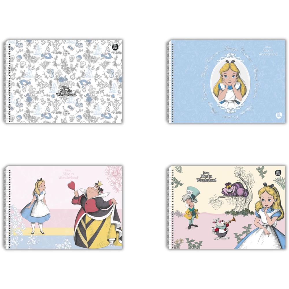 Caderno de Desenho Capa Dura Espiral Alice Formato: 275 x 200mm Folhas: 60 Capa dura- com 4 opcoes de capas Papel 63gm Espiral: Preto Adesivos