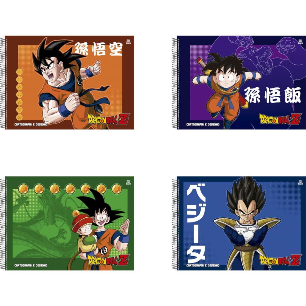Caderno de Desenho Capa Dura Dragon Ball Z Formato: 275 x 200mm Folhas: 60 Capa dura- com 4 opcoes de capas Papel 63gm Espiral: Preto Adesivos