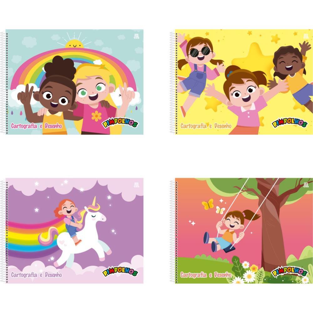 Caderno de Desenho Capa Dura Espiral Pimpolhos Feminino Formato: 275 x 200mm Folhas: 60 Capa dura- com 4 opcoes de capas Papel 63gm Espiral