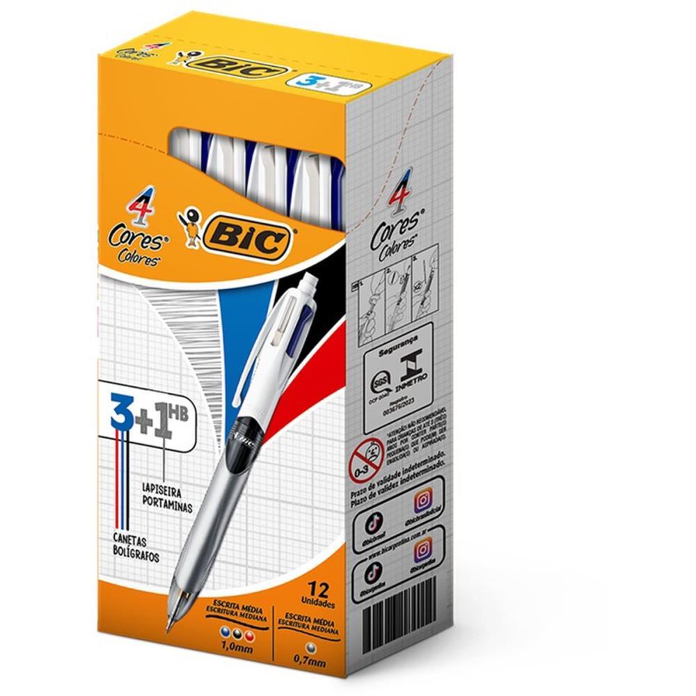 A Caneta BIC 4 Cores e um icone de mercado! Nesse modelo 3+1, com apenas um clique no botao, voce seleciona a cor que deseja, ou uma opcao de lapiseira. Ele ainda possui cinza emborrachado, dando um ar despojado a essa caneta tao iconica da BIC. Conta com escrita media de 1.0mm com largura da linha de 0.4mm. e uma opcao de lapiseira. Alem disso, nao trava durante o uso.