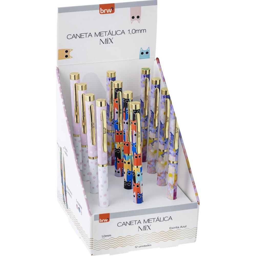 CANETA ESFEROGRAFICA E METALICA MIX, POSSUI PONTA DE 1,0MM, POSSUI MECANISMO GIRATOTIO, DETALHES EM DOURADO, DISPLAY COM 12 UNIDADES SENDO 03 ESTAMPAS: FLORAL, GATINHOS E POA. ESCRITA NA COR AZUL E CODIGO DE BARRAS INDIVIDUAL. EXCELENTE OPCAO DE PRESENTE.