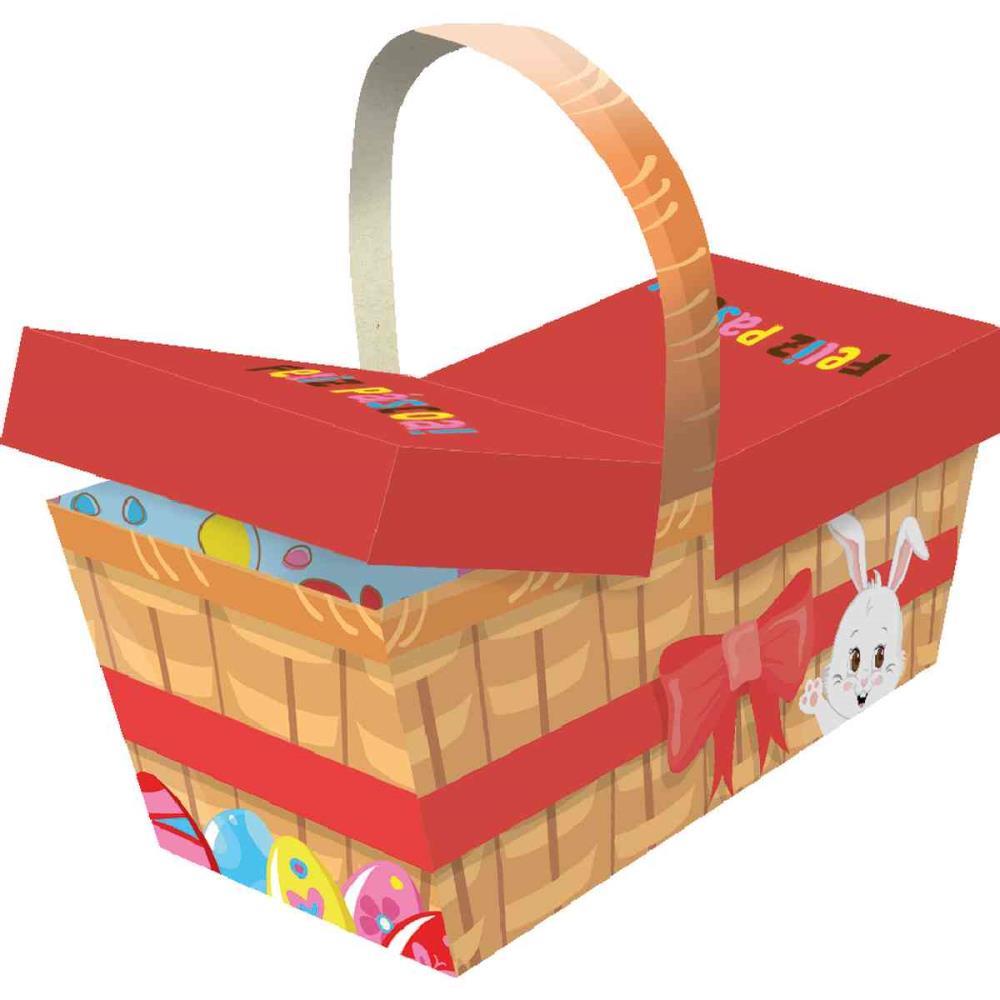 CESTA EM PAPEL CARTAO, FORMATO DE PIQUENIQUE, COM TAMPA E ALCA, TAMANHO M, PASCOA DIVERTIDA.