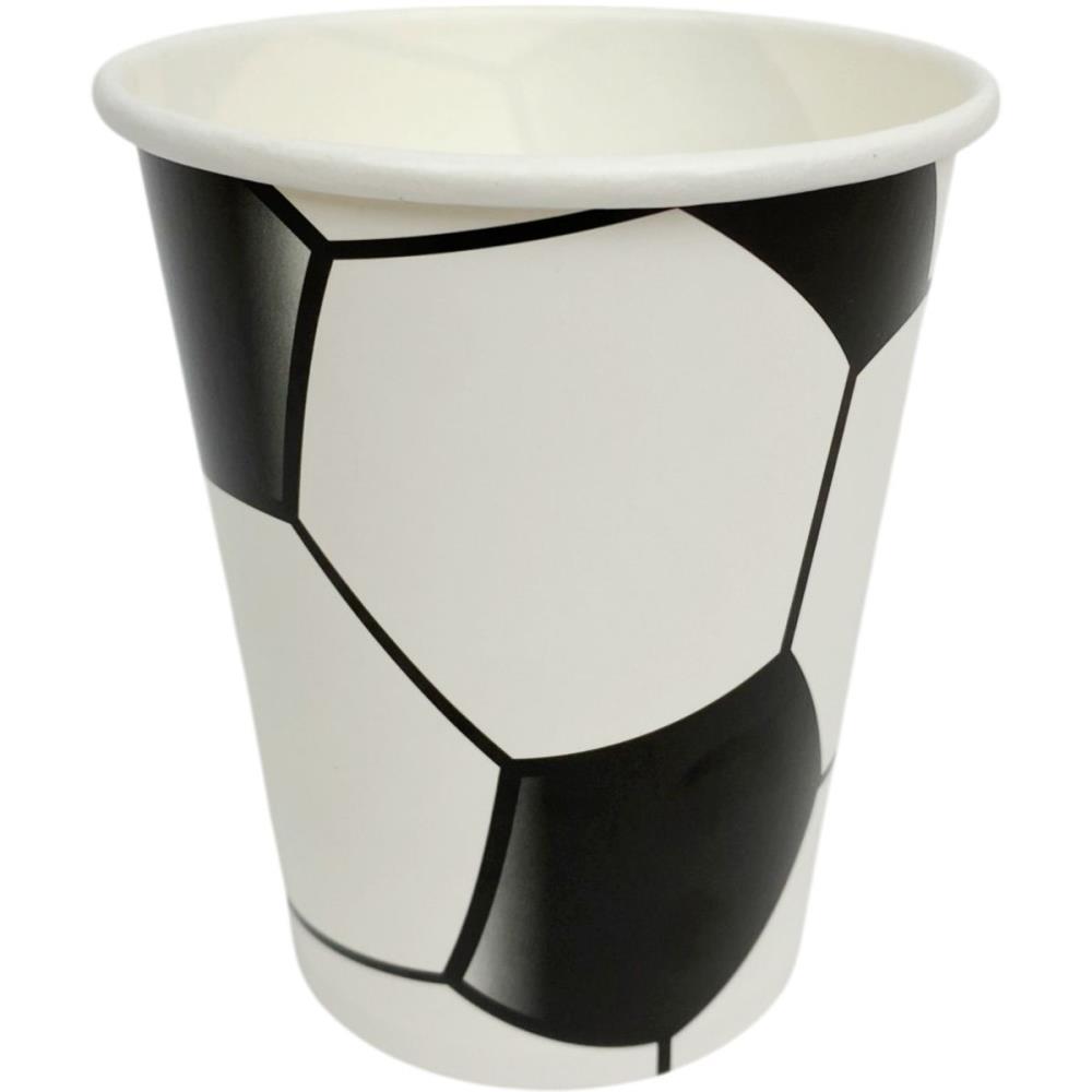 Copo de papel com estampa de bola de futebol, ideal para deixar a mesa de festas e eventos esportivos ainda mais divertida e tematica. Perfeito para servir bebidas, sucos ou refrigerantes, combinando com aniversarios, reunioes e celebracoes com tema futebolistico.
