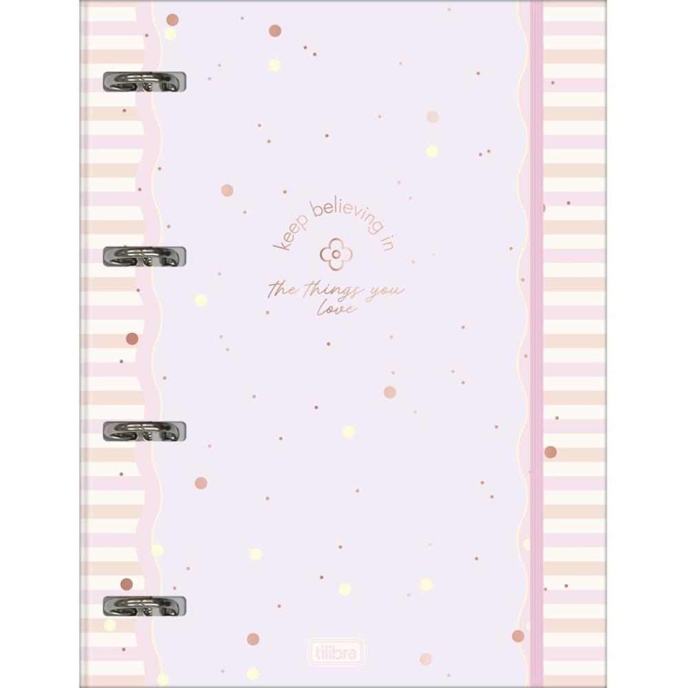 O Caderno Argolado Cartonado Universitario com Elastico Soho 48 Folhas da Tilibra une praticidade e sofisticacao, com capa dura metalizada, elastico, parte interna decorada, adesivos, bolsa plastica e folhas pautadas e decoradas, ideal para organizar suas anotacoes.