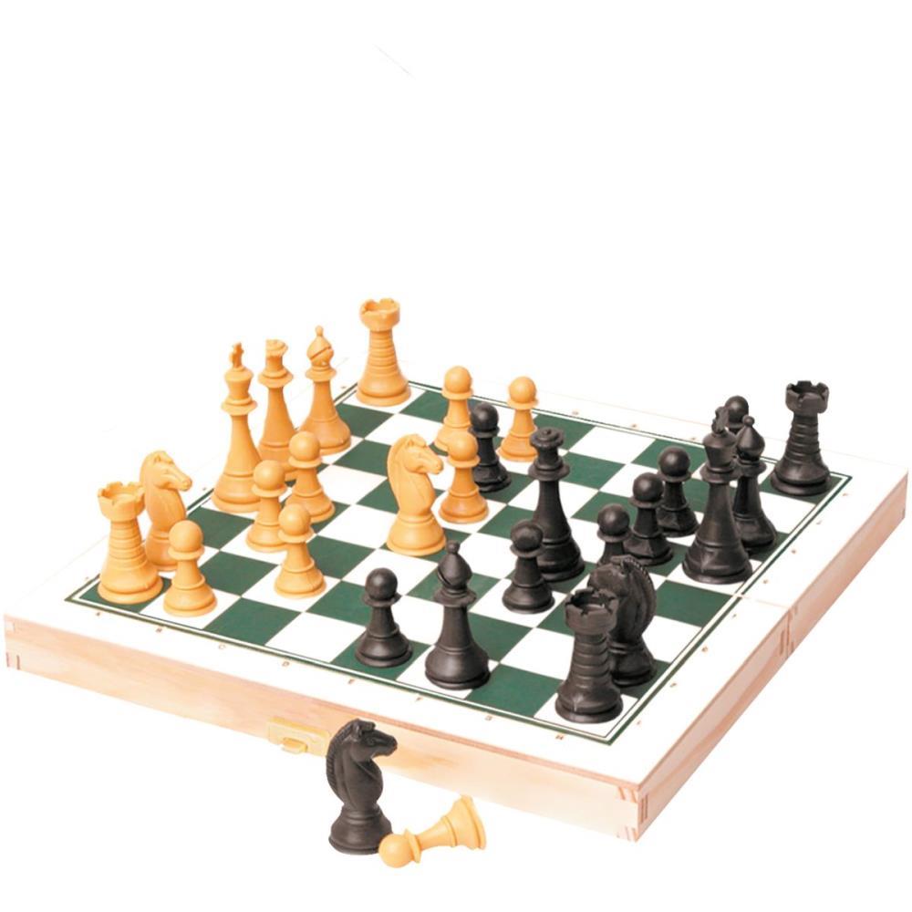 Proporciona mais concentracao e raciocinio logico aos seus usuarios. O tabuleiro em madeira, serve tambem como caixa para guardar as pecas. Tabuleiro 26 x 26cm e casa de 3 cm, acompanham pecas plasticas e rei com 5,6 cm. Indicado para criancas acima de 7 anos.