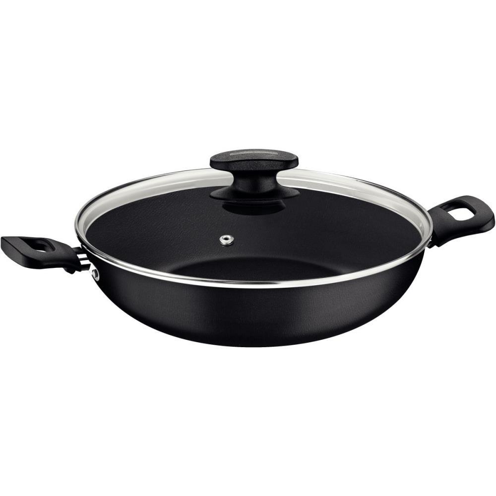 Prepare receitas incriveis e cheias de sabor, com o auxilio da wok Tramontina Loreto em aluminio com revestimento interno e externo em antiaderente Starflon Max grafite 28 centimetros de diametro 3,3 litros. Ideal para quem gosta de preparos pratico e ageis, ela tem corpo com 1,8 milimetros de espessura produzido em aluminio. Seu revestimento e em Starflon Max, antiaderente que evita que os alimentos grudem na superficie e a torna muito mais facil de limpar. A wok ainda vem com tampa de vidro temperado com borda de aco inox e tem alcas de baquelite antitermico e pegador em nylon, que oferecem maior seguranca durante o manuseio. Para facilitar suas tarefas na cozinha, ela pode ser levada a maquina de lavar loucas. Escolha Tramontina e trans