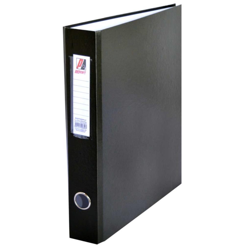 Pasta registradora Oficio Estreito Preta. Forração externa em cartão plastificado preto e forração interna branca sem plastificação. Dimensões: 380x280x55mm.