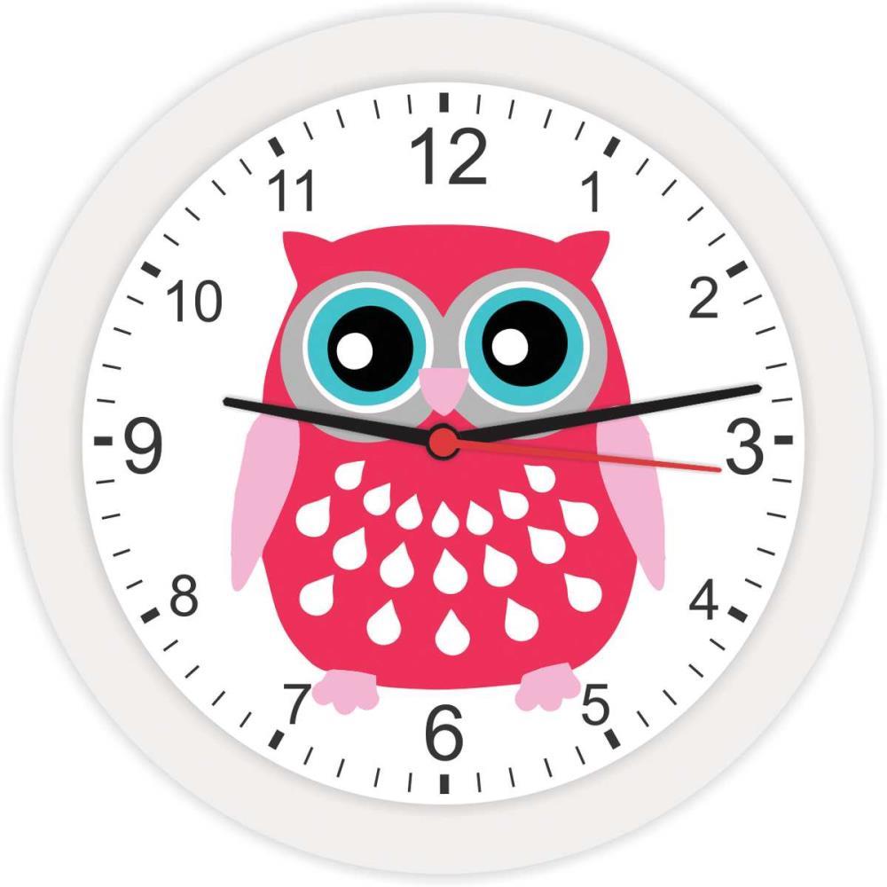 Relógio de Parede Redondo Corujinha. Sua borda é em polipropileno, visor em PS cristal, possui botão de regulagem na parte traseira do produto.
